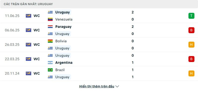 5 trận gần nhất của Uruguay: W-L-D-L-D