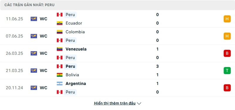 5 trận gần nhất của Peru: D-D-L-W-L