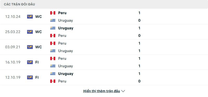 Thành tích đối đầu của Uruguay vs Peru