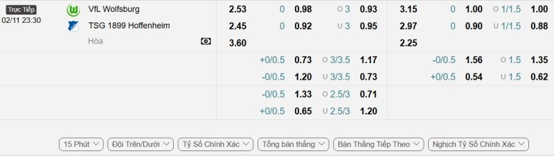 Bảng Tỷ lệ kèo bóng đá VfL Wolfsburg vs TSG Hoffenheim