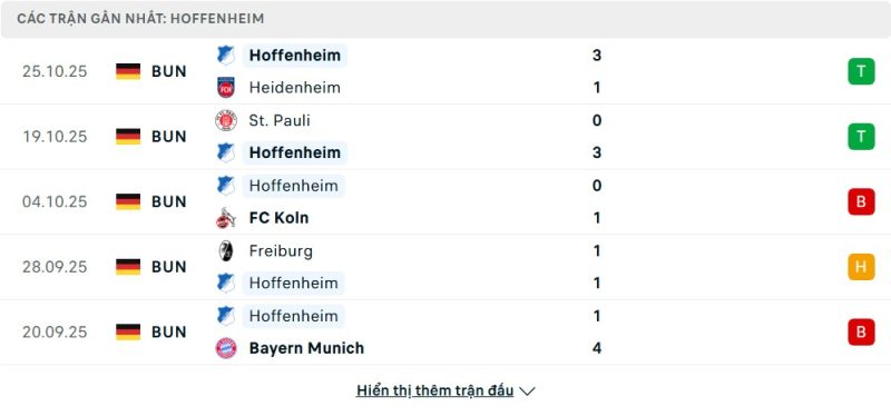 5 trận gần nhất của TSG Hoffenheim: W-W-L-D-L