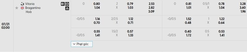 Bảng Tỷ lệ kèo bóng đá Vitória vs Red Bull Bragantino