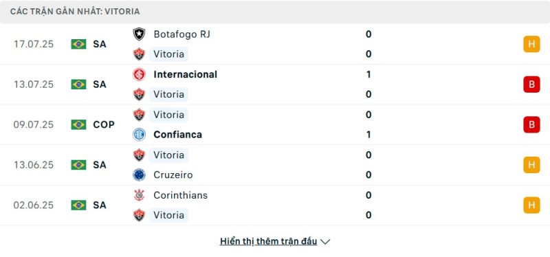 Vitória đang trải qua một chuỗi trận vô cùng đáng quên. Trong 8 trận gần nhất trên mọi đấu trường, họ không giành được bất kỳ chiến thắng nào, với 5 thất bại và 3 trận hòa. Hàng công thiếu sắc bén, trong khi hàng thủ lại thường xuyên mắc sai lầm ở những thời điểm quyết định. Trận gần nhất gặp Botafogo RJ, họ tiếp tục thể hiện bộ mặt nhạt nhòa và không thể ghi bàn. Vị trí của Vitória ở nhóm cuối bảng xếp hạng hoàn toàn phản ánh phong độ đáng lo ngại này.