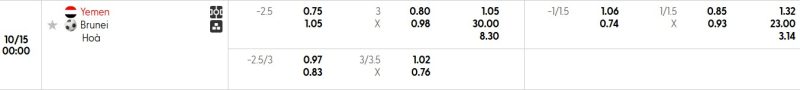Bảng Tỷ lệ kèo bóng đá Yemen vs Brunei