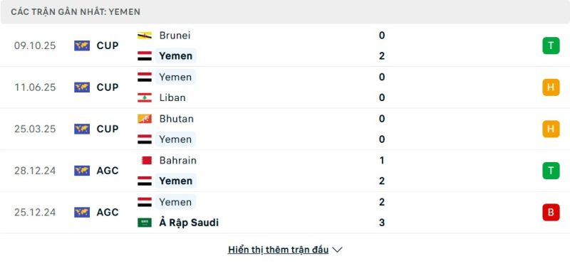5 trận gần nhất của Yemen: W-D-D-W-L