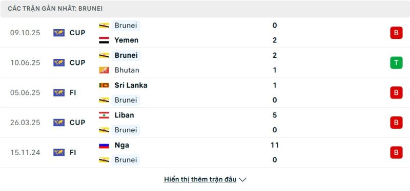 5 trận gần nhất của Brunei: L-W-L-L-L